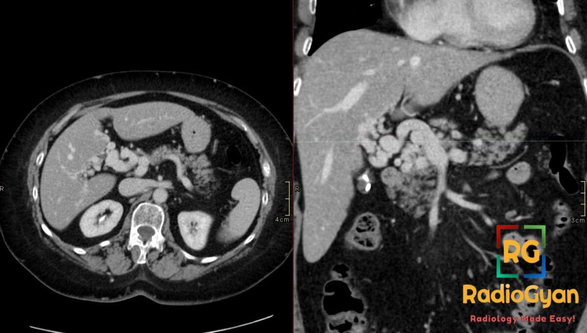 - Signs: Portal cavernoma: A sponge-like mass or tangle of enhancing vessels in the porta hepatis representing dilated periportal collaterals.