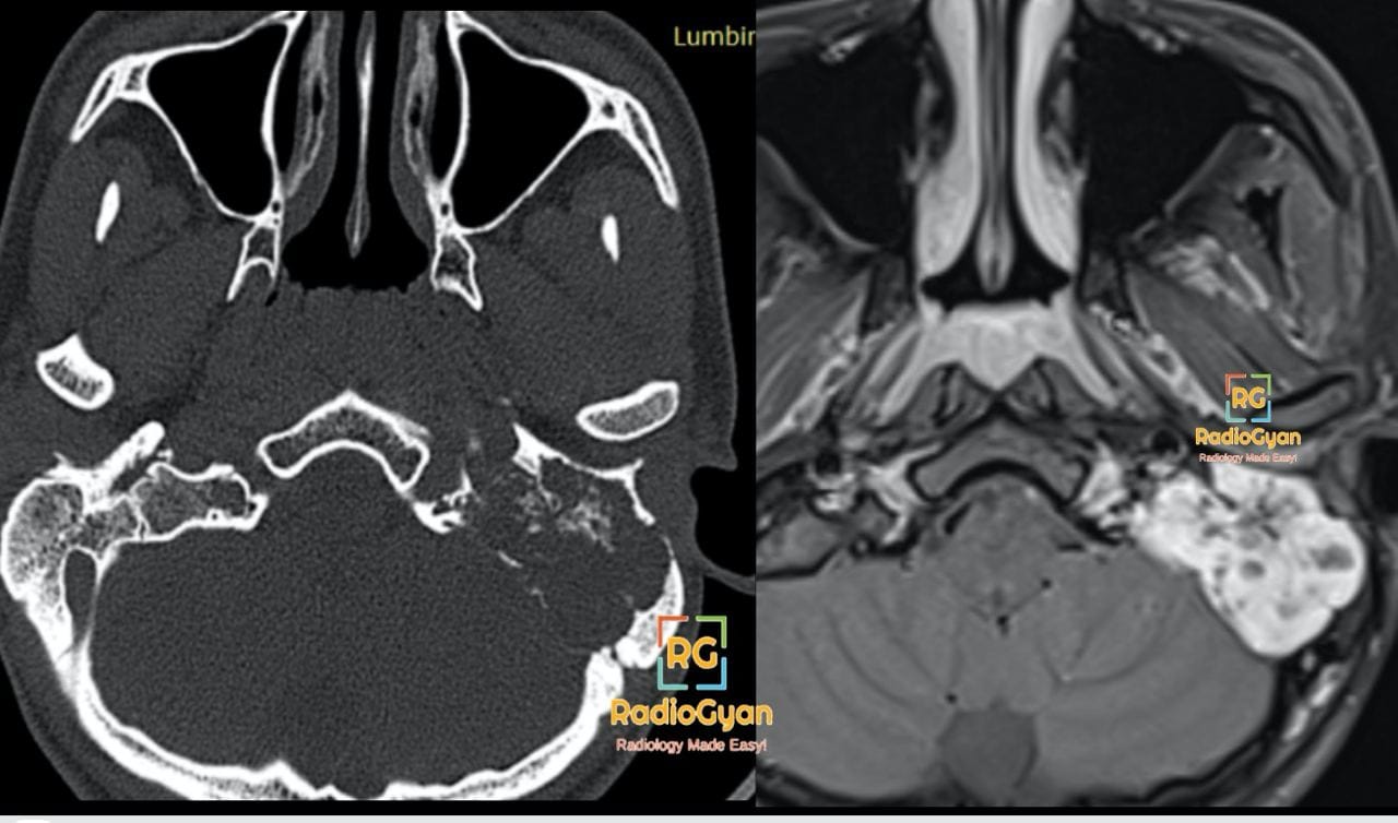 This is an axial computed tomography (CT) scan and an axial magnetic resonance imaging (MRI) scan of the skull base, demonstrating a Left Glomus Jugulare Paraganglioma. The CT scan on the left shows bone erosion and destruction involving the left jugular foramen. The MRI on the right reveals a brightly enhancing, lobulated mass in the same region, consistent with the diagnosis.