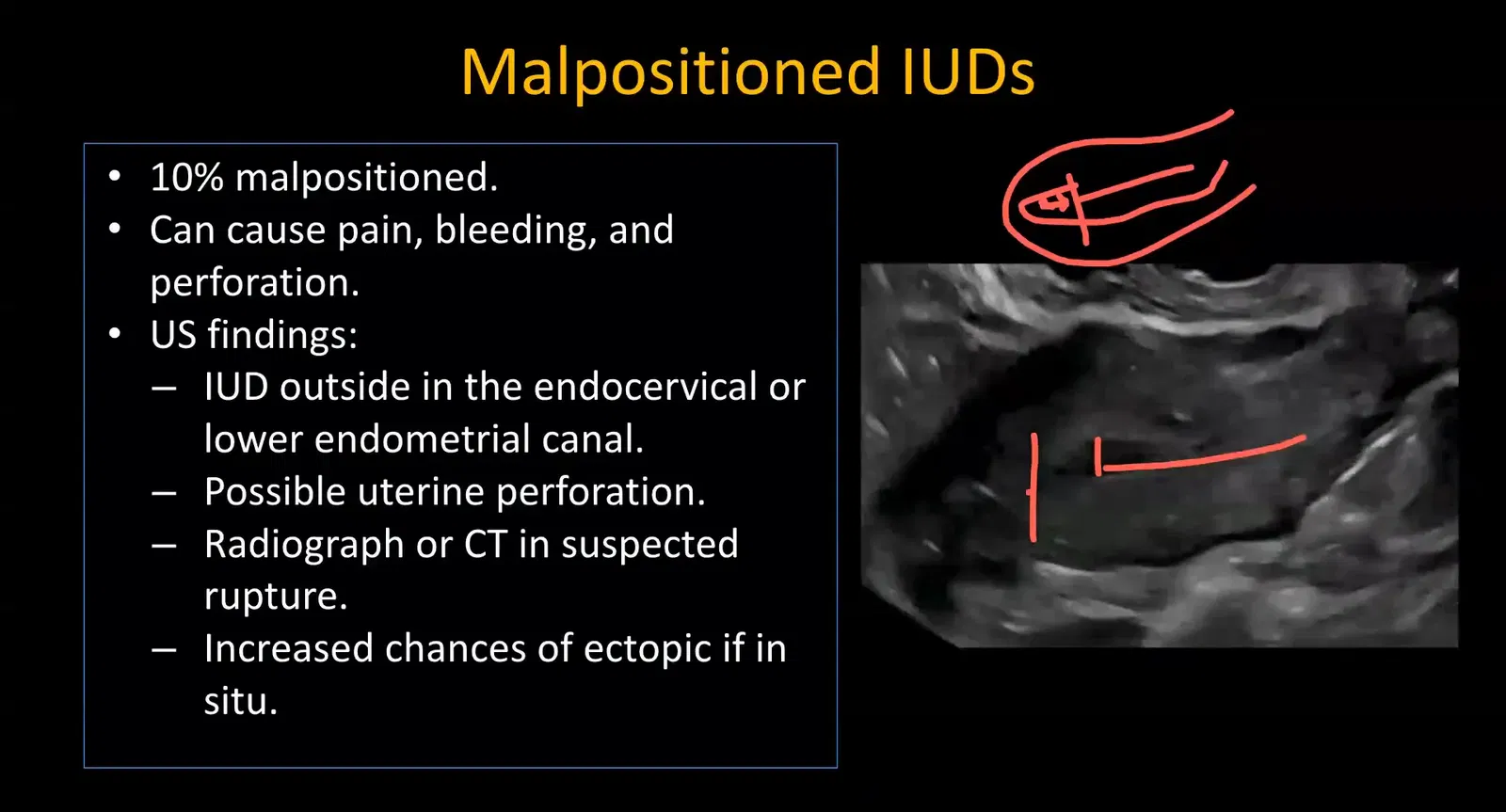 On ultrasound, malposition is suspected if the IUCD limbs are asymmetrical or if the device is not visualized in the uterine cavity. Radiographs are used to localize the device. CT is performed if the device is outside the uterus to assess for perforation.